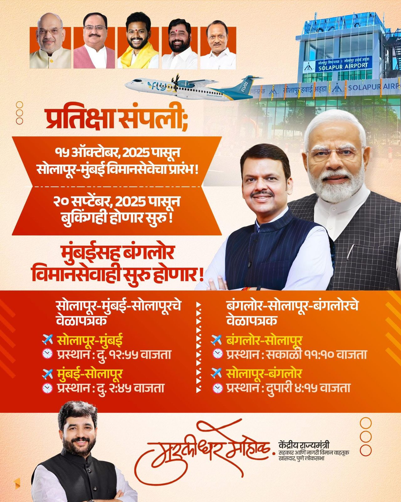 नवरात्रीच्या शुभमुहूर्तावर सोलापूरला मिळणारी ही दुहेरी भेट सोयीस्कर, वेगवान आणि आधुनिक वाहतुकीकडे एक मोठे पाऊल आहे ! या विमानसेवेमुळे सोलापूरकरांना राज्याची आर्थिक राजधानी मुंबई तसेच दक्षिण भारतातील औद्योगिक केंद्र बंगळुरूशी थेट व जलद हवाई संपर्क मिळणार आहे. व्यापारी, उद्योजक, विद्यार्थ्यांसह भाविकांसाठीही या नव्या सेवेमुळे प्रचंड सोय होणार आहे.